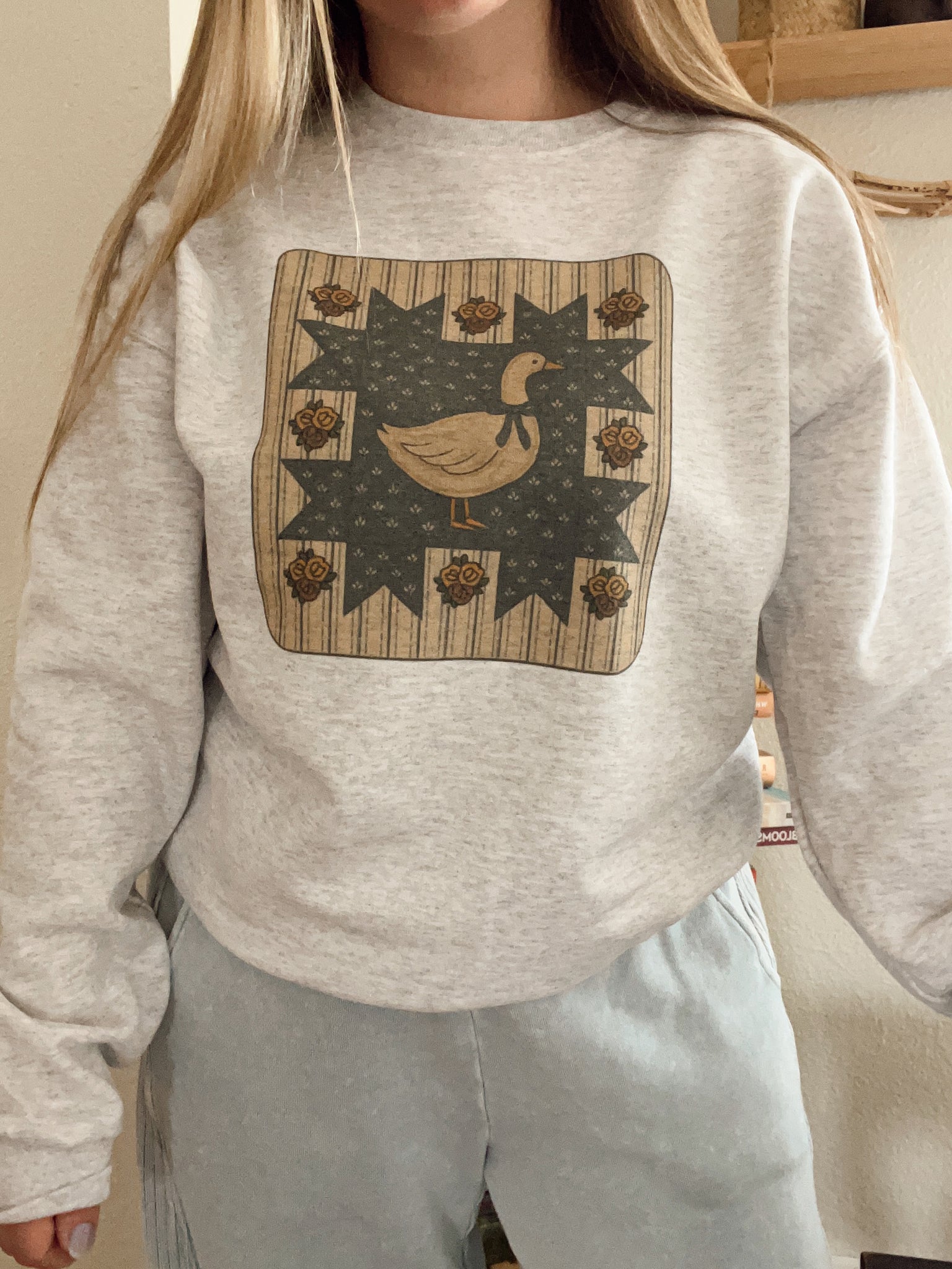 Printed on our Classic Crewneck in ash grey, 50/50 poly/cotton blend.
